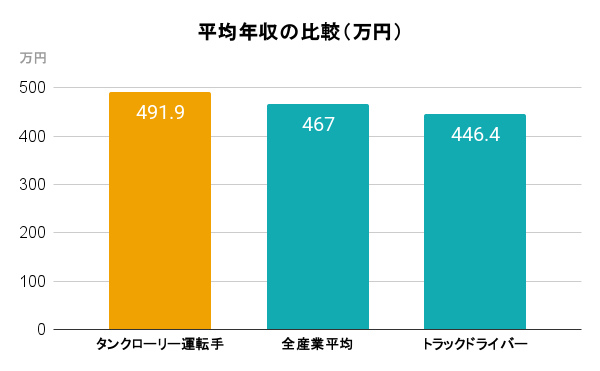 この水準は、国税庁が公表している全産業の平均年収467万円を上回っており、タンクローリー運転手の給与が比較的高いことがわかります。
