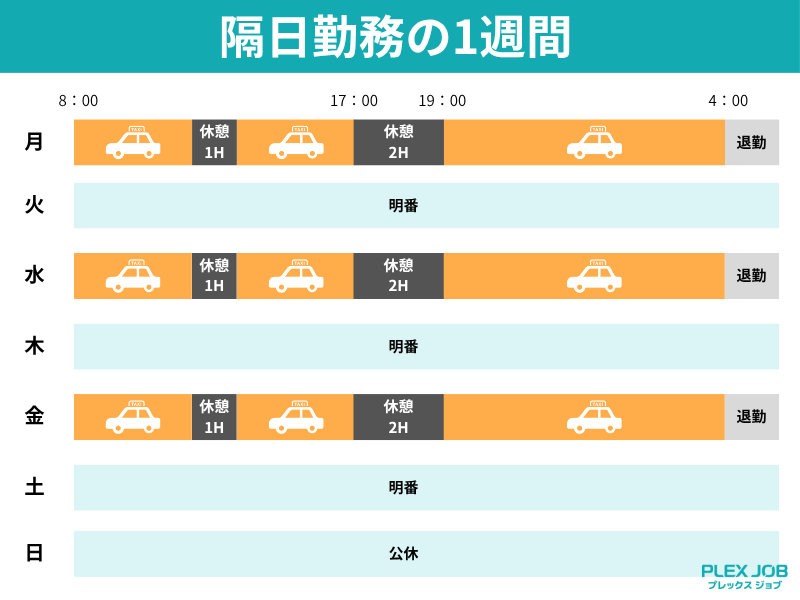 電車やバスが運行していない時間帯が稼ぎ時となるため、夜間と朝方の両方をカバーする隔日勤務という働き方が主流となっています。