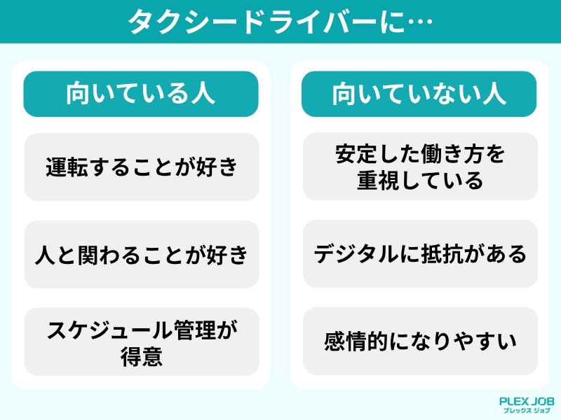 タクシードライバーは収入や働き方が個人の裁量に左右される仕事のため、安定志向の強い人には向かない職業です。