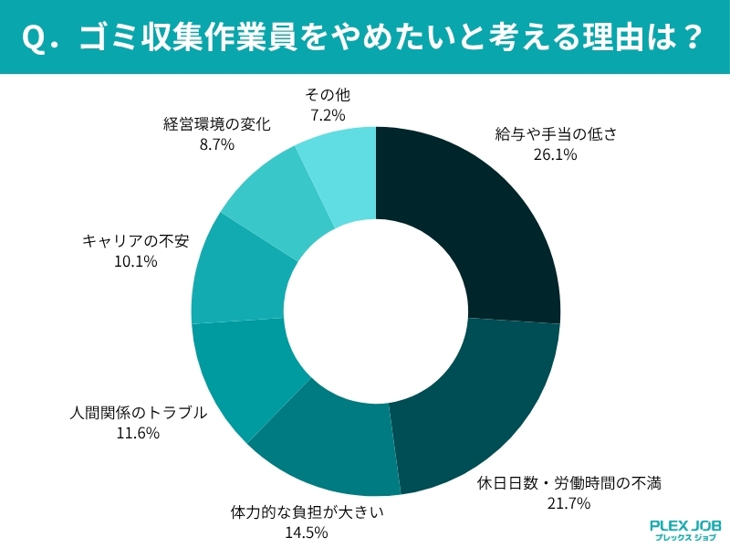 プレックスジョブをご利用いただいたゴミ収集作業員の方、約70名を対象に「やめたいと感じる理由」を調査しました。結果は以下の通りです。