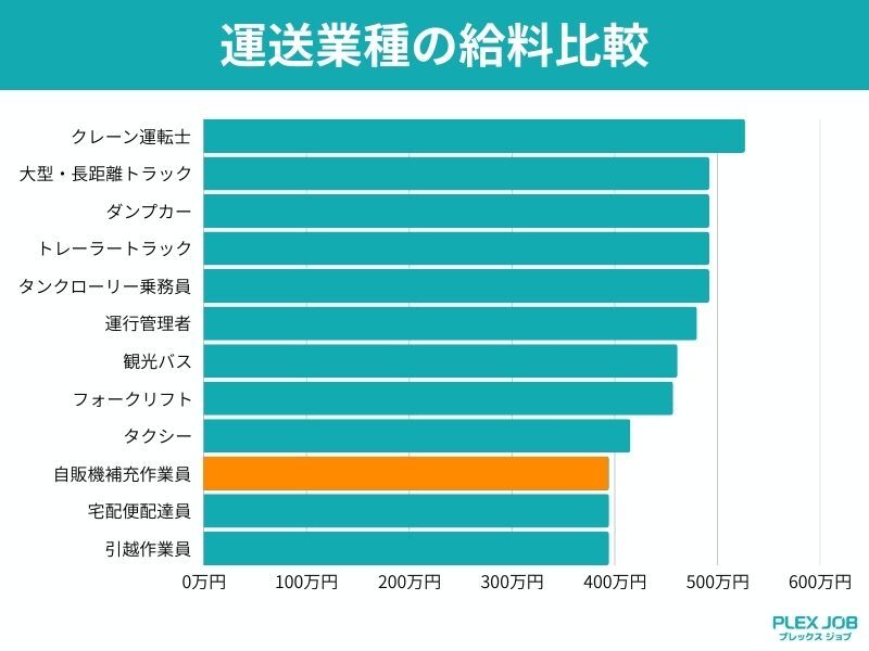 他の運送職種と比較すると、大型免許が必要な長距離ドライバーよりは低いものの、一般的なルート配送や宅配便と同水準です。